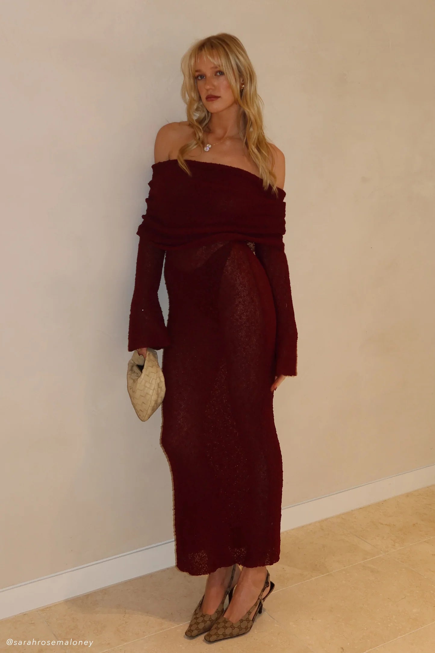 MARISOL is a ribbed design dress made from a Boucle material that is both flattering from up close and across the room. The natural stretch of the fabric creates a figure-sculpting silhouette, while also featuring a unique drape-styled, off-shoulder neckline combined with flared long sleeves.