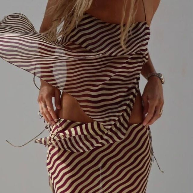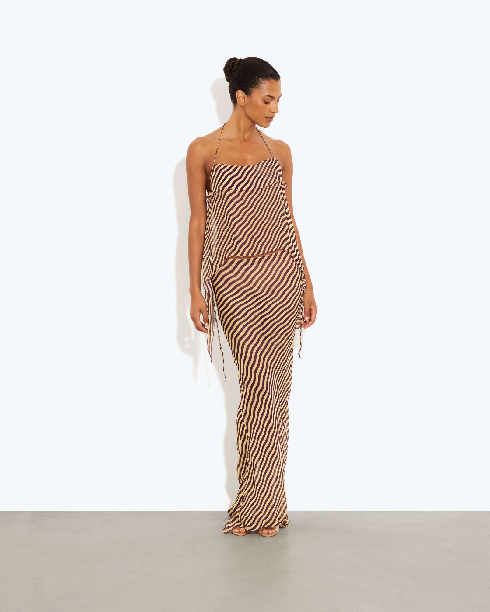 A wear-anywhere summer wardrobe staple, the 90s-inspired Assisi maxi skirt & top is printed with striking waves in a rich dark purple. Crafted from a sheer, luxurious crinkle chiffon, it's cut to a perfectly simple, sexily low-rise silhouette and finished with a train to the back and delicate waist ties.